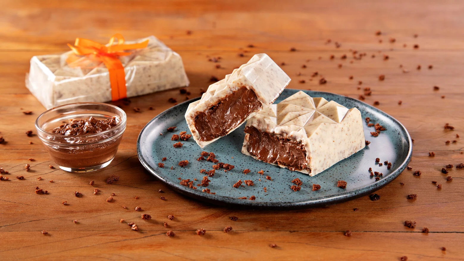- Após cristalizado, retire da forma, tire as rebarbas para dar acabamento, e coloque na forma novamente, preencha com Ovomaltine® Creme Crocante.