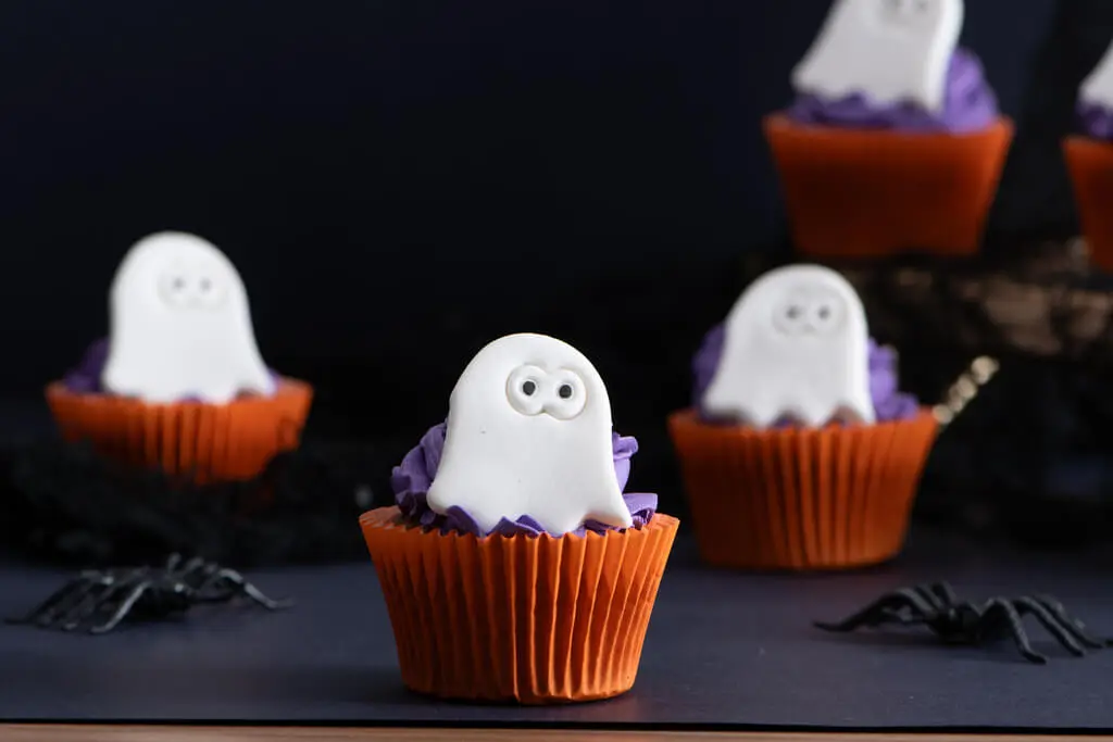 - Depois de frio, faça um buraco no centro para rechear com muito Ovomaltine ® Creme Crocante e finalize com a decoração de Halloween (sugestão chantily roxo com elemento temático feito em pasta americana: o fantasma)