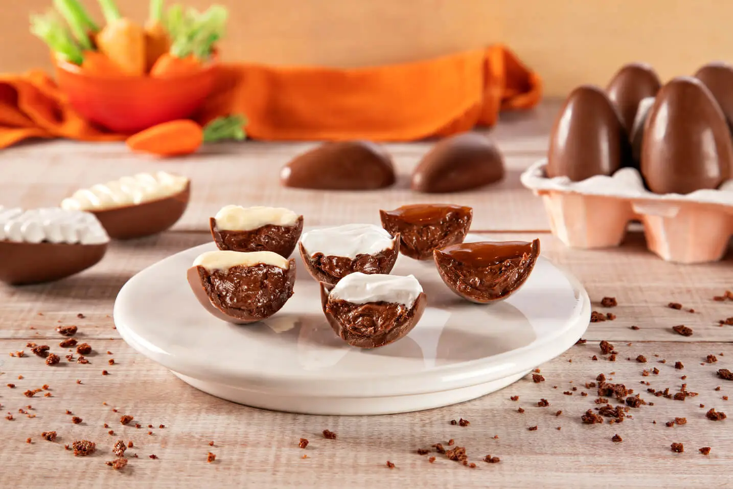 Nas casquinhas de chocolate, coloque uma quantidade de Ovomaltine® Creme Crocante, e finalize com a cobertura/recheio.